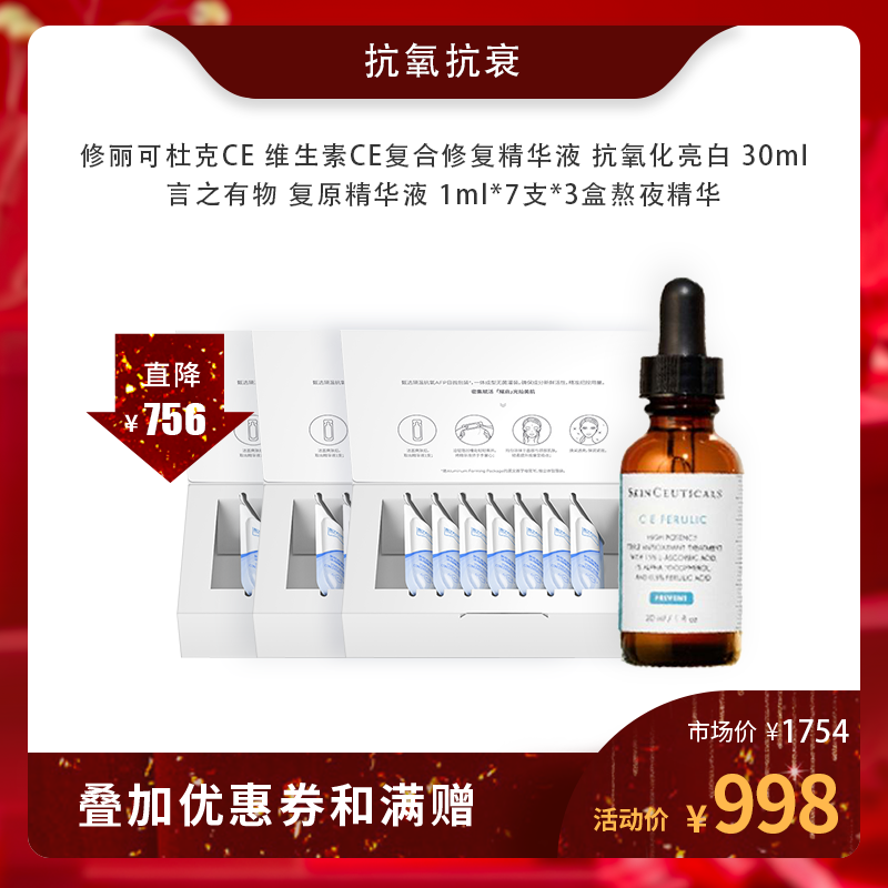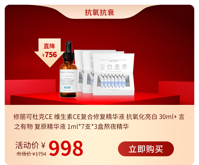 耐受皮看到这个组合不要犹豫,冲就对了!修丽可CE,可以说是VC精华里的天花板了,可以和它叫板的产品屈指可数。来看看官方自己实际临床实验测试之后的效果对比图:可以看出测试者在经过一段时间使用之后,面部整体肤色均匀提亮和皮肤细腻度上,都有肉眼可见的改善,眼周和唇周的纹路,也得到了一定程度的淡化。所以说,修丽可CEF作为抗氧化届“一姐”般的存在之一,不是没有道理的。自它问世之后,虽然被其他品牌效仿,出了很多平价替代,但是人家的多年研究出来的专利技术,目前来说还是无法复制的。CEF除了自身就非常强大的抗氧化能力,基于专利技术还衍生出了其他抗氧化剂无法达到的功效,官方售价达到1490元,而我们加上熬夜精华液只要998!言之有物的熬夜精华,应该不用我再多介绍了吧?配方打出了一套紧急修护组合拳——10%的二裂酵母发酵物+海茴香提取物,小棕瓶同款二裂酵母提取,浓度也相同,能够减少紫外线引起的皮肤损伤,并提高皮肤的自我修护能力。赫莲娜绿宝瓶同款海茴香干细胞提取物,急救修护的同时还能提亮。强强结合修护熬夜损伤的胶原蛋白,抵御熬夜带来的皮肤松弛,让你hold住!城野医生377美白精华18g