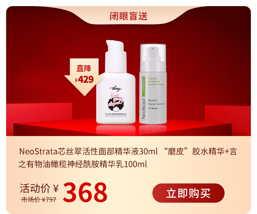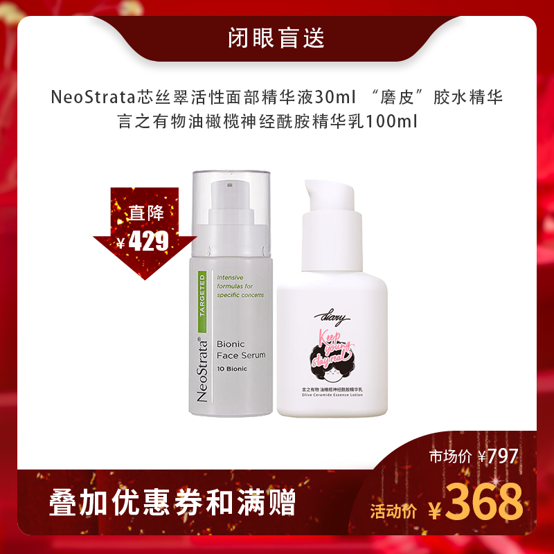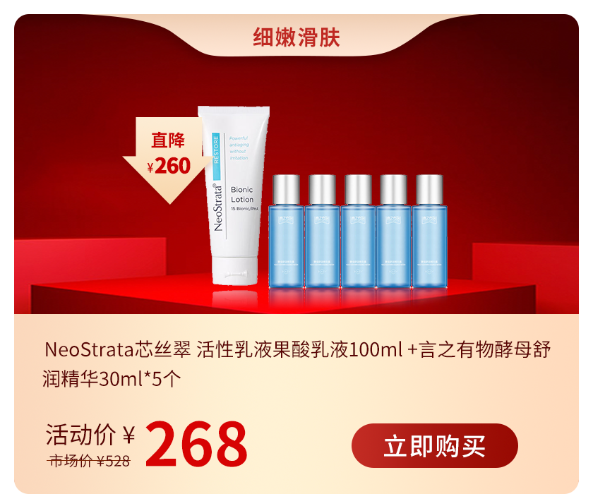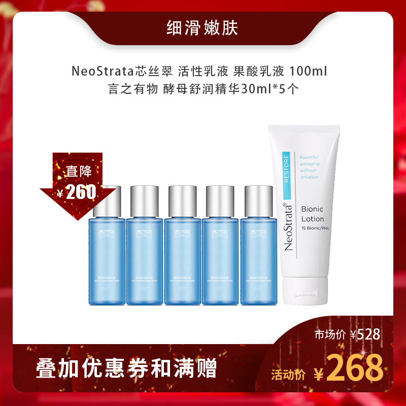 各类口碑王者护肤单品一个不够,都想要怎么办?别担心,满足你!我们搭配来买价格更实惠!你们最爱的米蓓尔轻龄紧致修护面膜、经典的NeoStrata芯丝翠活性面部精华液、芙丽芳丝净润洗面霜等等产品全部都有,买的越多省的越多~如果糖精宝贝想要兼顾维持肌肤微生态+配合一个温和的酸类来精简护肤,又能达到比较全面的护肤功效?选这套准没错,芯丝翠的活性乳液十分强大~调节粉刺、亮肤美白、抗氧抗衰,都可以做到,同时保证了温和不刺激。芯丝翠活性乳液100ml,主打12%葡糖酸内酯+3%的乳糖酸,15%的多羟基酸,功效涵盖所有你能想到的护肤诉求。大家不要被这15%的果酸浓度给吓到,国内护肤品对一代果酸的监管浓度上限为6%,二代三代四代果酸是不纳入这个监管范畴的,可见其温和度。只要不是太敏感的皮肤都可以冲,有时候洗完澡只想躺尸时,懒得涂很多层精华,那就直接抹一层活性乳液,然后睡觉~功能齐全,比某些精华还强大。而言之有物的酵母精华露,自然也不必多说,后生元二裂酵母发酵产物溶胞物+益生元“锁水磁石”的糖类同分异构体。它们能够有效提高角质层含水量,增强肌肤对抗外界刺激的能力,舒缓肌肤,恢复屏障健康。质地清爽,即可作为一款水,也可以作为精华来使用,百搭小能手,和任何其他功效产品都不冲突。NeoStrata芯丝翠