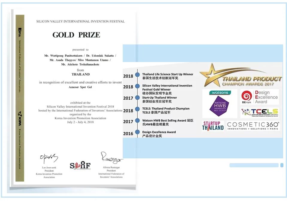 原来ACNOC祛痘凝胶一推出就拿到了美国硅谷国际发明节金奖。强大的祛痘实力和好口碑也让它拿奖拿到手软。