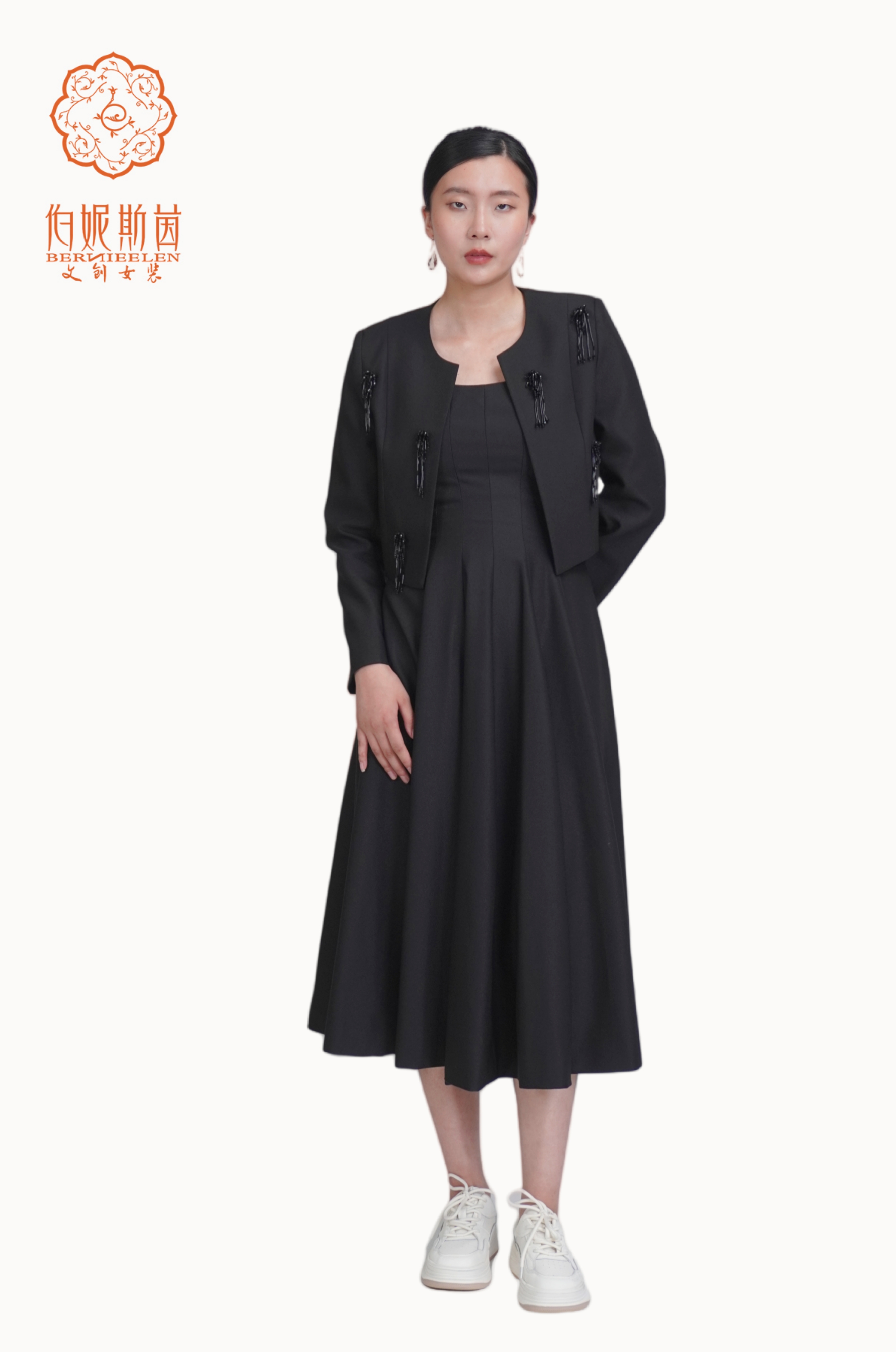 外搭的黑色小外套,是整套搭配的点睛之笔。肩部的精致剪裁,精心点缀流苏砖饰元素,为深沉的黑色增添了几分华丽与俏皮;