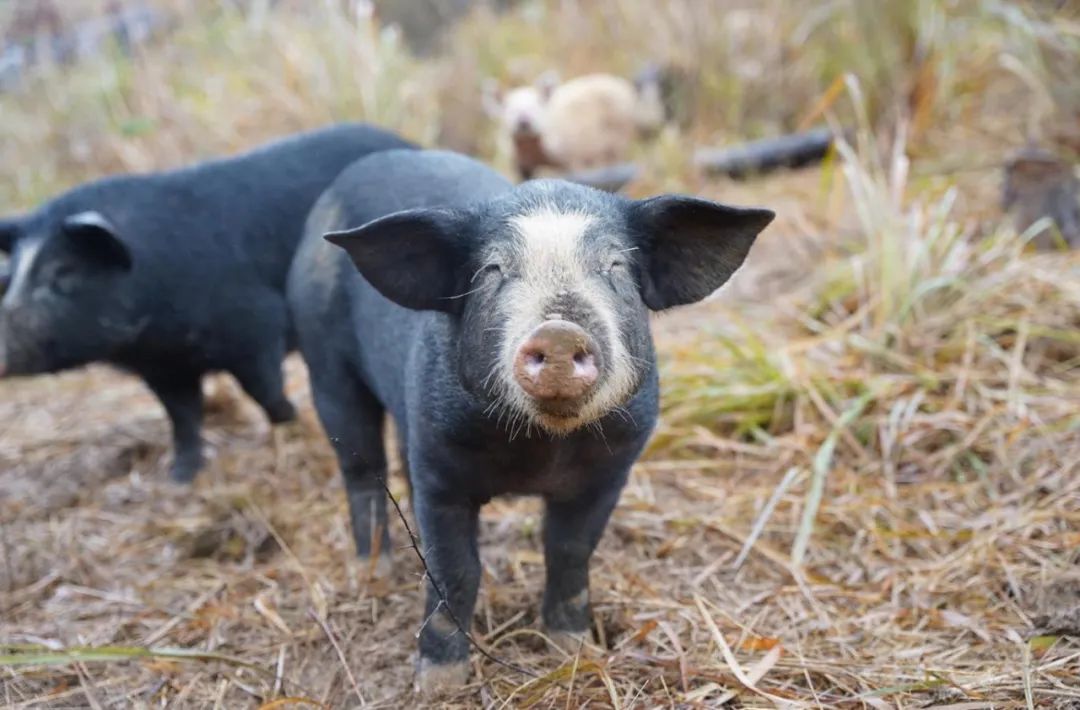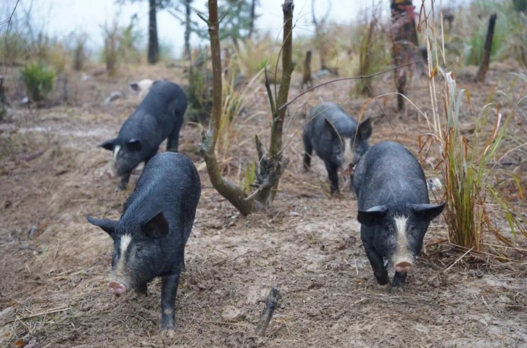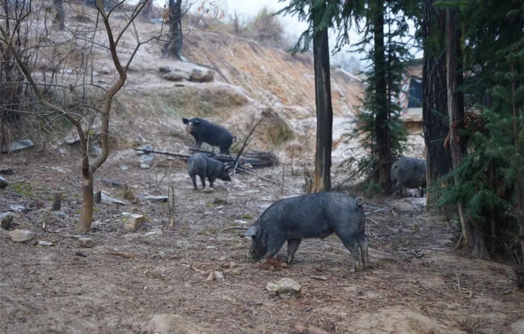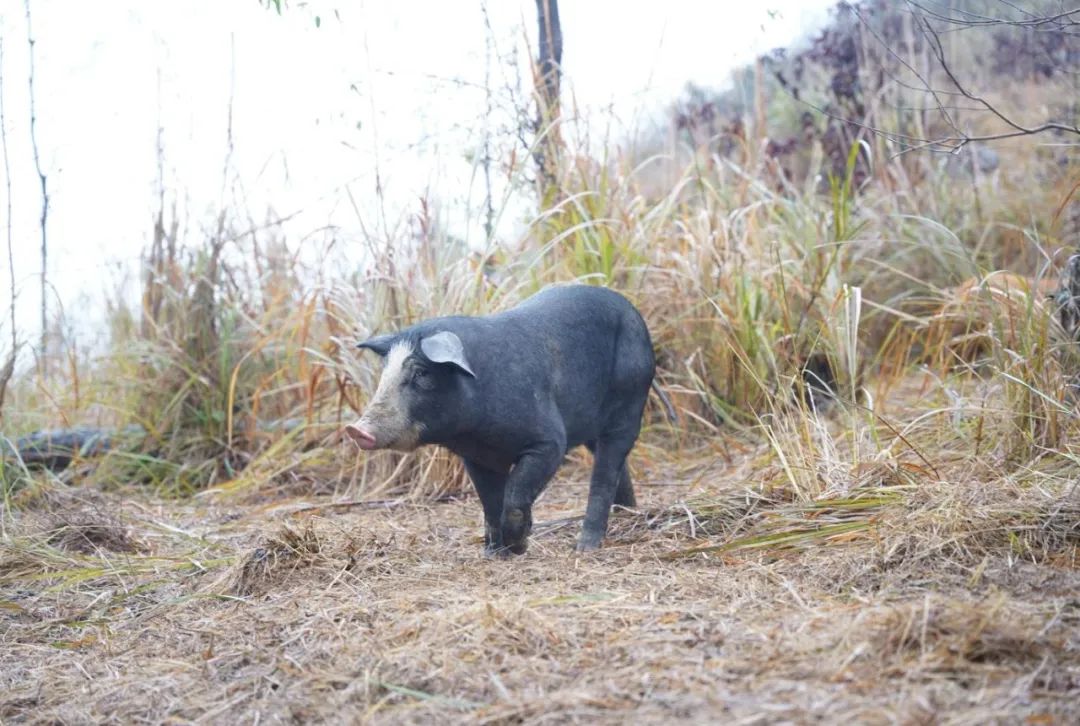 生活在这里的小黑猪不同于人工圈养的白猪,它们以山林为家,以山间有机植物为食,不喂食饲料,不拘泥于方寸空间,每日翻山奔跑,长至最重也只有120斤左右,故称为跑山小黑猪。