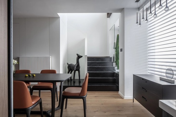 黑白灰是整个空间的主导色彩,最大限度的保留了白色的体量,让整体空间透亮,白净。客厅分为前后区,兼顾了书房的作用。光影变幻中,以日常必须的沙发组、收纳柜体与电视柜加以组合,进而保持简约恬适的调性。