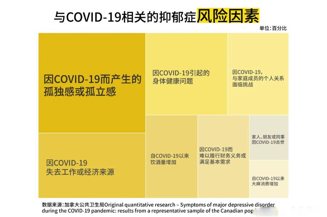2020年期间,不良心理健康的风险因素增加,停工停产使经济发展无法得到保障,许多人因此失去工作和经济来源,而同时紧密的社会联系、平稳的参与就业和教育、充分的体育锻炼等保护因素在减少。 加拿大公共卫生局的研究表明,由新冠疫情直接或间接引发抑郁症的风险中,因疫情而产生的孤独感或孤立感是最突出的问题,其他风险因素还包括健康问题、家庭关系的挑战、亲人朋友因新冠去世等。