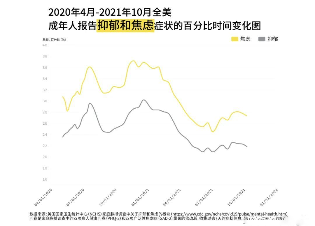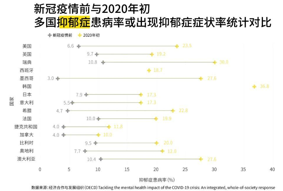 无独有偶,放眼世界,多国出现抑郁症患病率大幅增长的现象。经济合作与发展组织的一项研究表示,许多国家的成年人报告自疫情开始以来,他们经历了难以独自应对的压力、焦虑或悲伤,社会精神健康状况恶化的趋势被证实。