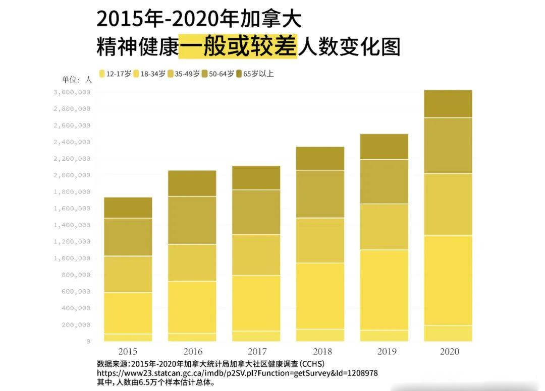 保持社交距离、戴口罩、居家隔离等是应对传染率极高的新冠病毒广泛传播最强有力的措施,而生命健康被最大程度地保护之时,社会的精神健康却面临着极大挑战。在加拿大国家统计局连续多年的社区健康调查中, 2020年感到精神健康状况一般或较差的人数急剧增加,其中18-49岁的人群增长幅度最大。