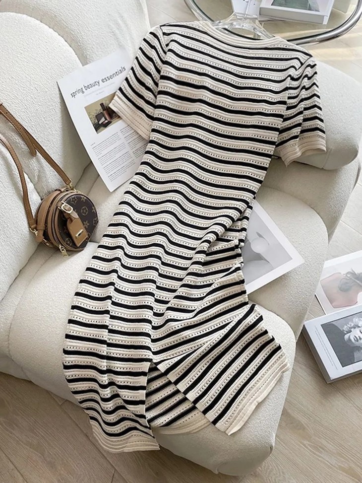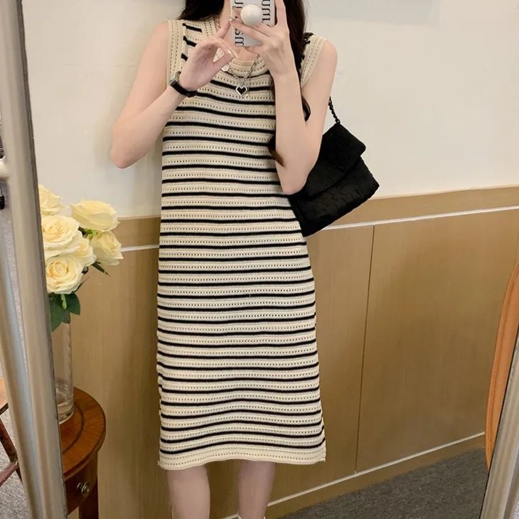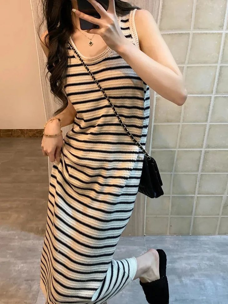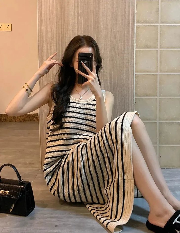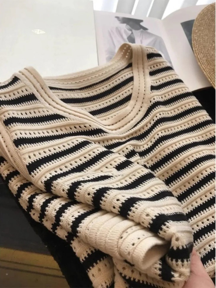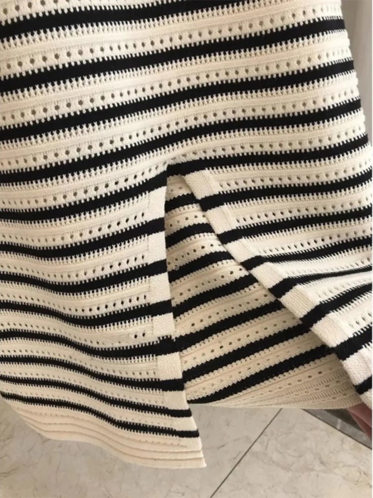 经典的条纹结合镂空针织,不挑人的奶杏色,春夏搭配刚需。