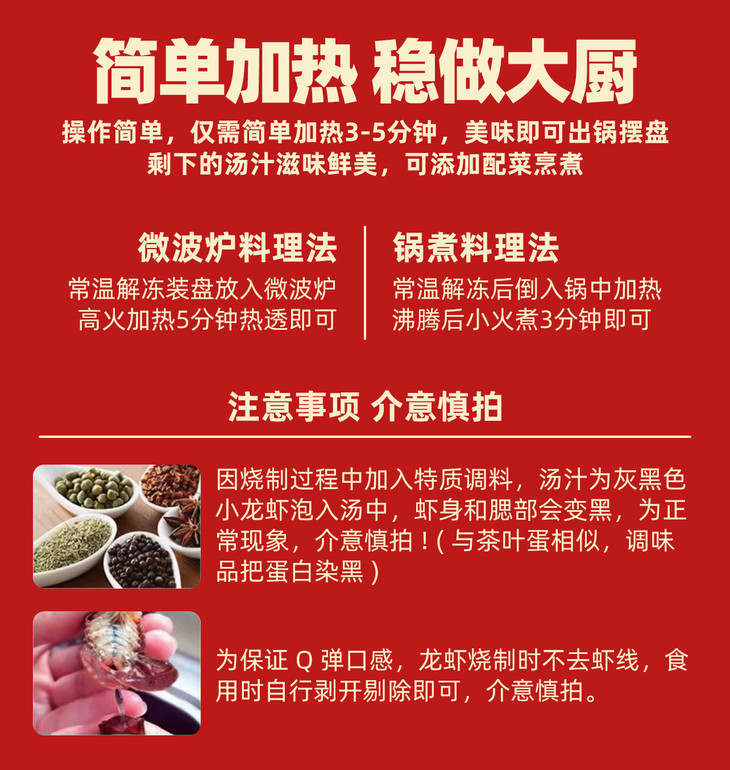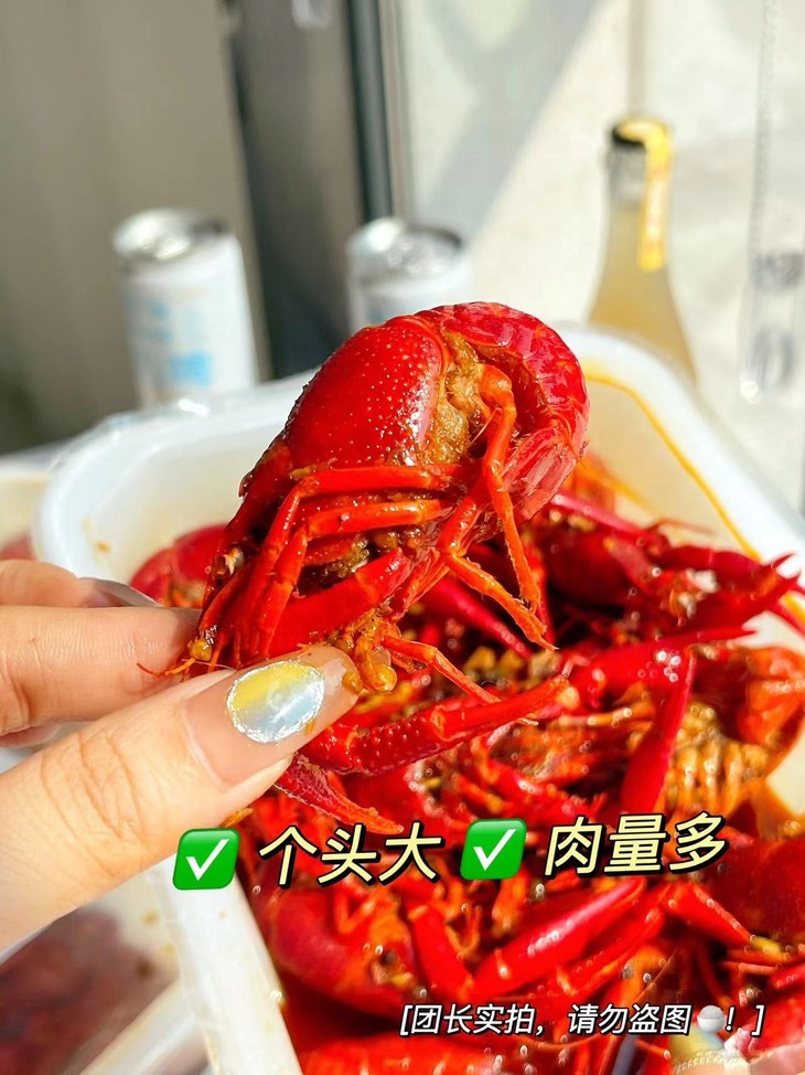 ☑价格便宜,超大个的整只虾☑产地优势,湖北潜江稻田虾☑食用方便,加热5分钟就能吃☑经典口味,麻辣劲爽吮指留香☑品质保障,精选规格与大小☑原汁原味,低温液氮保鲜