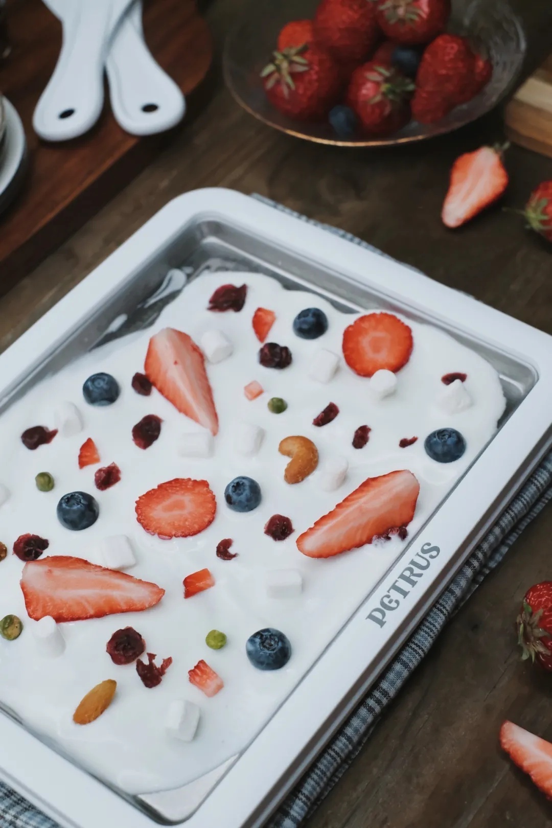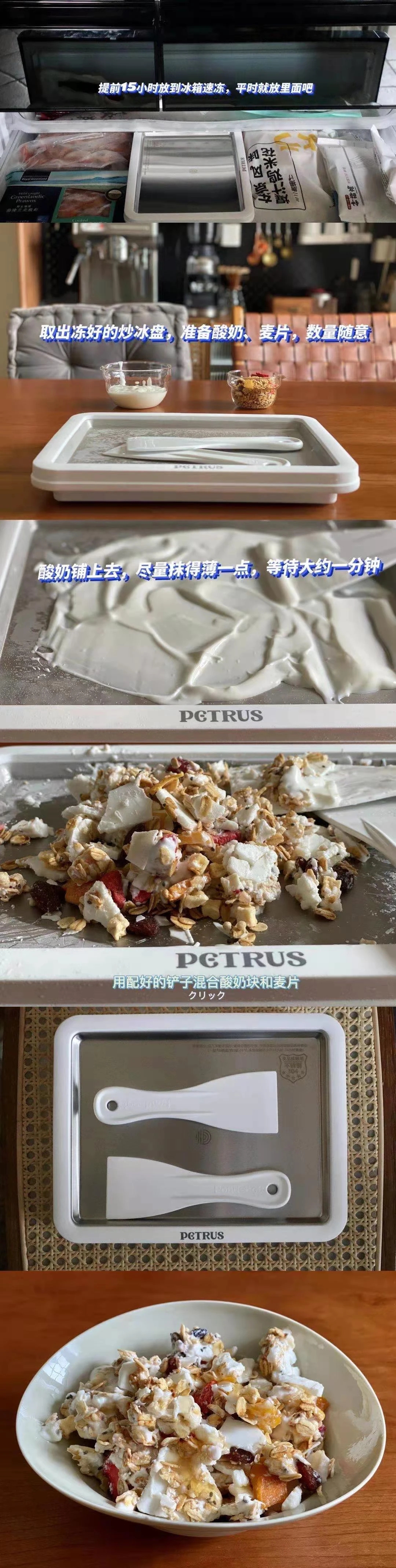 第1步,倒入酸奶,用炒冰铲抹平,加入自己喜欢的水果,冰盘就开始自动给食材制冷啦~