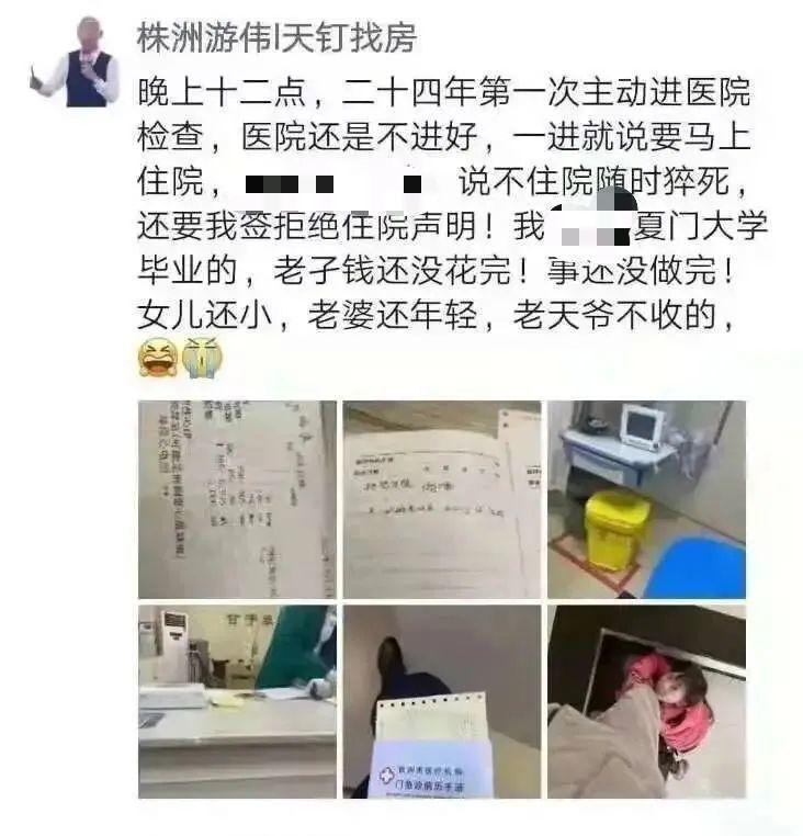 “晚上十二点,二十四年第一次主动进医院检查,医院还是不进的好,一进就说要马上住院,吓我说不住院随时猝死,还要我签拒绝住院声明,老子钱还没花完!事还没做完!女儿还小,老婆还年轻,老天爷不收的!”