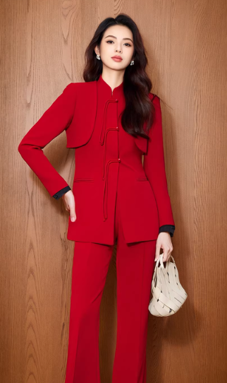 新年就该穿得热烈又耀眼,这套中国红西装是当之无愧的战袍。新中式立领设计致敬传统,利落剪裁又贴合当代审美。