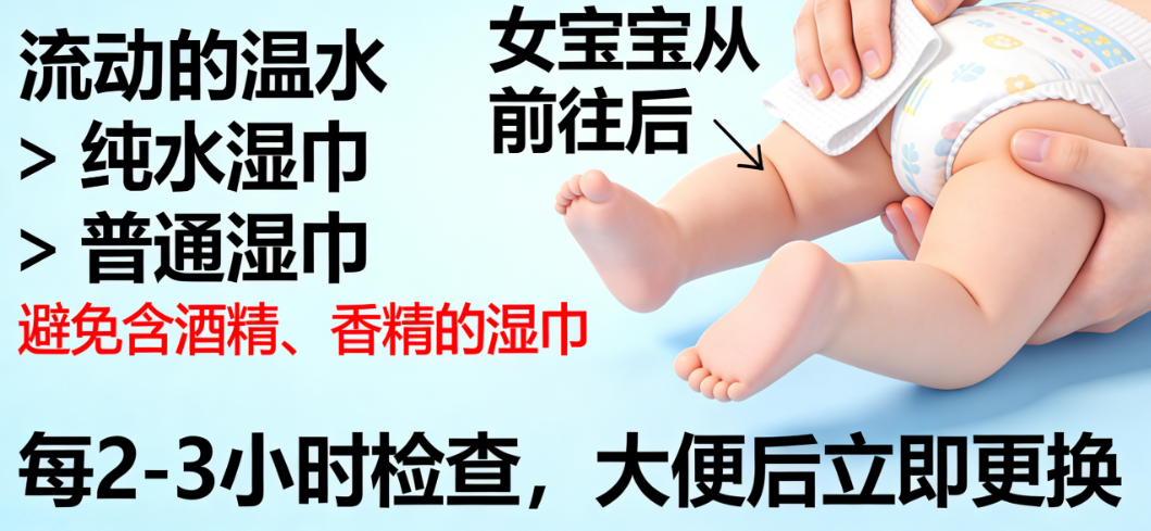 1.工具选择:流动的温水 > 纯水湿巾 > 普通湿巾。避免使用含酒精、香精的湿巾。