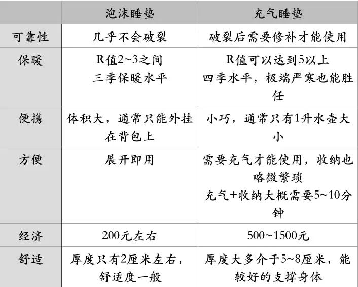 如果平时喜欢睡软的床垫,对舒适度有较高要求,应该选择充气睡垫。如果对舒适度并不那么敏感,能接受硬板床,可以考虑泡沫睡垫。