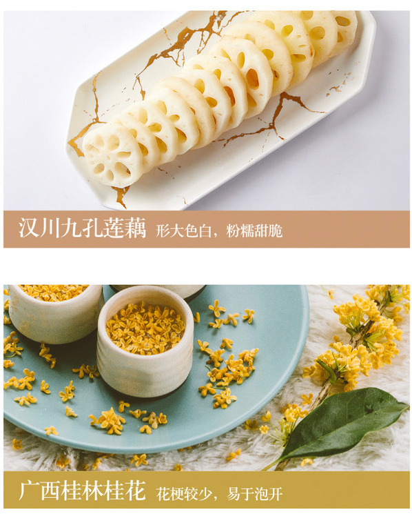 藕粉中的桂花也是精挑细选,广西桂花有股诱人的花香,口感特别甘甜,给藕粉羹增添了不少姿色,开袋就能闻到。