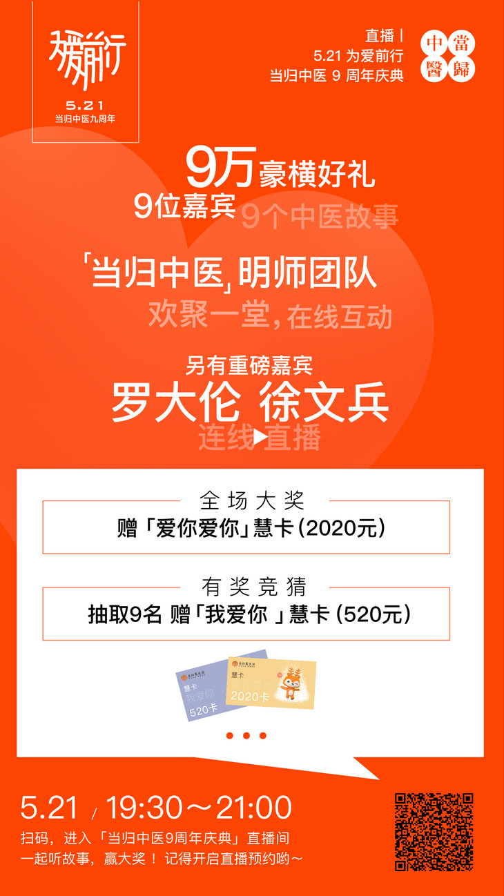 全场所有人,均可抢答2道关于当归中医的趣味答题,我们将从答对者中随机抽取面值520元(9张)和2020元(1张)的当归慧卡,共计10张;