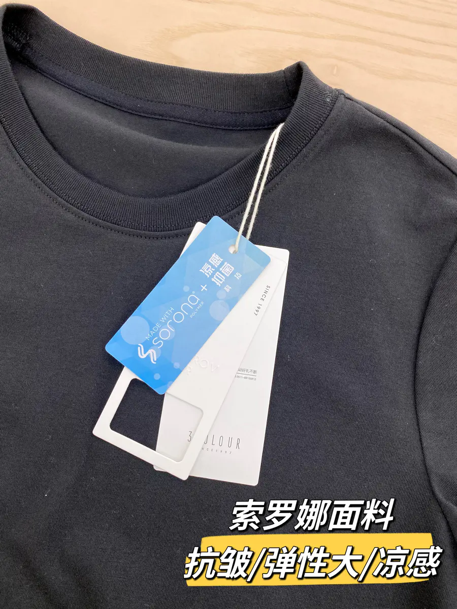 T恤部分则是今年用的很多的索罗娜面料,弹性很大,并且自带凉感,黑色也不怕闷热;