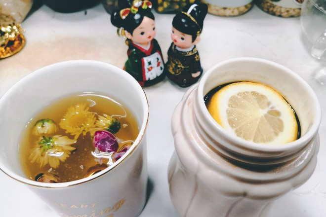 用料:新鲜柠檬3片、玫瑰花、白菊2片、山楂干5颗