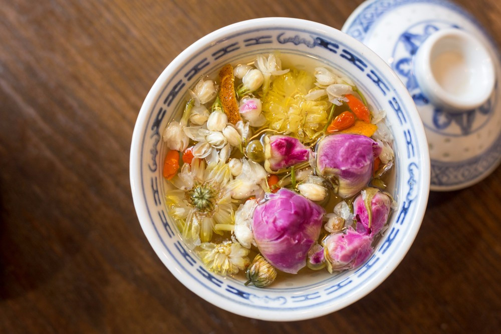 用料:玫瑰花5朵,枸杞5粒,桂圆2颗,陈皮3g,菊花1朵