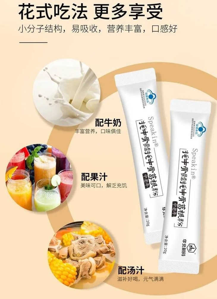 以牦牛骨为核心,又加入牦牛骨髓、葛根粉、酪蛋白,合理组方,小分子、补得进、好吸收!