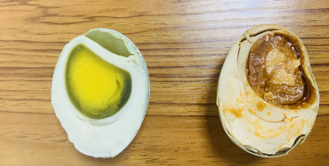 左:普通咸鸭蛋 右:烤海鸭蛋