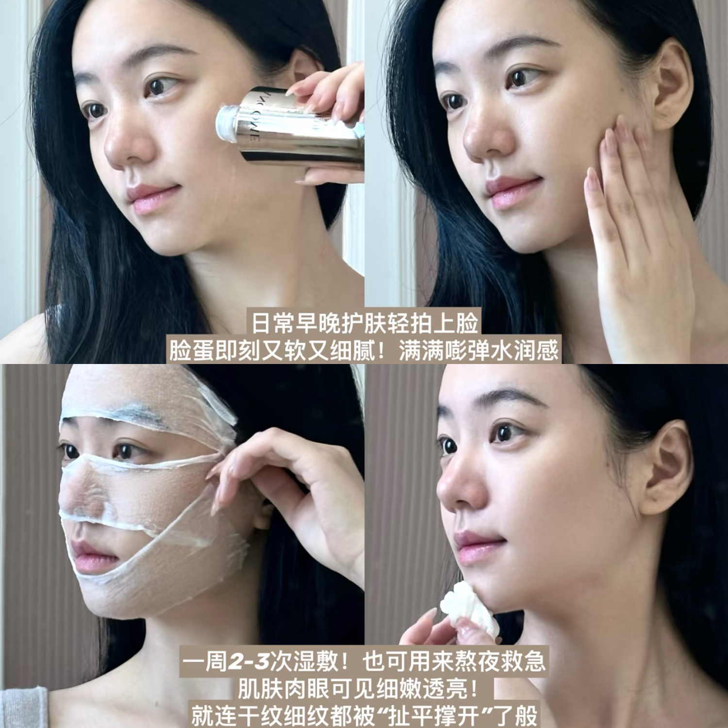 使用方法也很灵活哦!日常早晚轻拍上脸,脸蛋立刻变得又软又细腻,满满的弹润感。而且它还可以当作湿敷神器,一周2-3次湿敷效果超赞!熬夜急救的时候,用它湿敷一会儿,肉眼可见肌肤细嫩透亮,就连干纹细纹都被“扯平撑开”了!