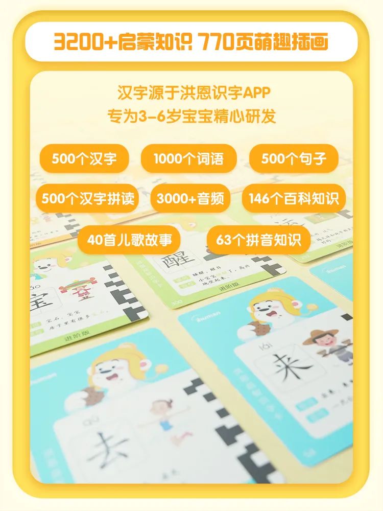 比如识字卡片,全面同步《洪恩识字》APP的1-500字。