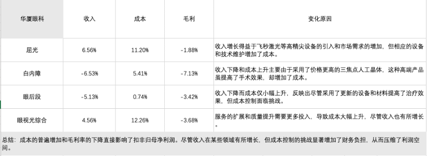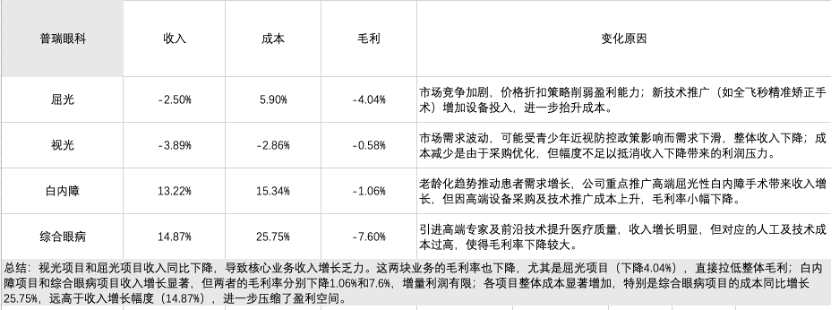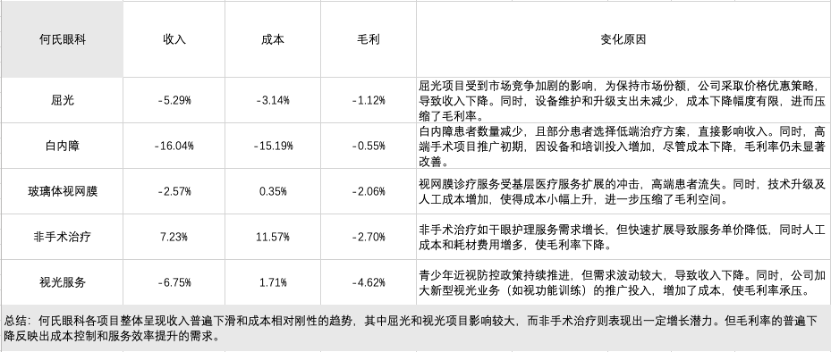 从净利润表现来看,爱尔眼科展现出较强的盈利能力,尽管同比略有下降,但扣非归母净利润降幅较小,表明核心业务较为稳健。华厦眼科净利润下降幅度较大,显示其成本和费用控制压力较大。普瑞眼科、何氏眼科和光正眼科全面陷入亏损,特别是光正眼科的亏损幅度惊人,反映其业务模式和成本结构面临严重问题。整体来看,行业分化明显,头部企业在盈利能力和抗风险能力上表现优越,而中小型公司需尽快优化成本结构、提升核心业务竞争力,否则亏损局面将进一步恶化。