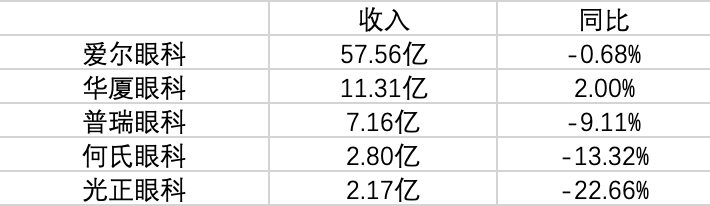 1、 收入压力:除华厦眼科外,其余眼科上市公司均体现了收入下降。这表明整个眼科医疗服务行业市场均受到整体需求增长放缓的影响,这很大程度上与消费降级或行业竞争加剧有关: