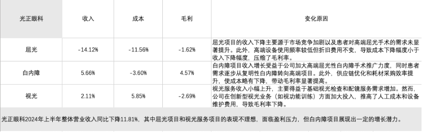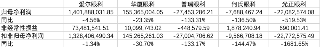 从收入表现来看,爱尔眼科和华厦眼科展现出更强的抗压能力,尤其是华厦眼科在行业整体下行压力下仍实现了小幅增长,显示出其市场竞争力和业务稳定性。相比之下,普瑞眼科、何氏眼科和光正眼科的收入均出现较大幅度下降,其中光正眼科降幅最为显著,反映其业务布局和市场扩展受到了明显的挑战。这种收入分化表明,行业领先者通过规模效应和品牌优势更能稳住市场,而中小企业在竞争加剧和消费疲软的环境下更易受冲击,亟需优化业务结构和提升核心竞争力以应对市场压力。
