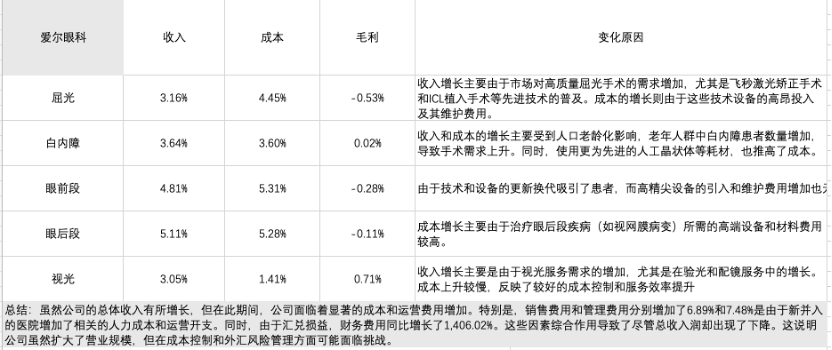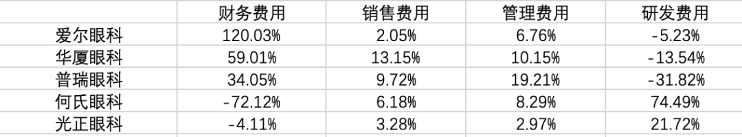 2、 费用压力:各公司销售和管理费用均增长。两项费用的增长意味着公司为开拓市场而进行的推广和管理开支,但结果却并未有效转化为收入增长,反而压缩了利润空间。此外,除光正眼科外,各公司的财务费用也均有较大幅度的增长,尤其是与扩张相关的借贷成本。爱尔眼科、华厦眼科和普瑞眼科的财务费用增长均为四大费用中增幅最大,而原因都是因扩张所需而进行借贷,而扩张又是抢占市场份额的重要手段。所以利润端的下降从另一个角度来看,可以解释为在收入增长放缓的同时,企业仍需投入额外资源以维持市场份额和运营质量。
