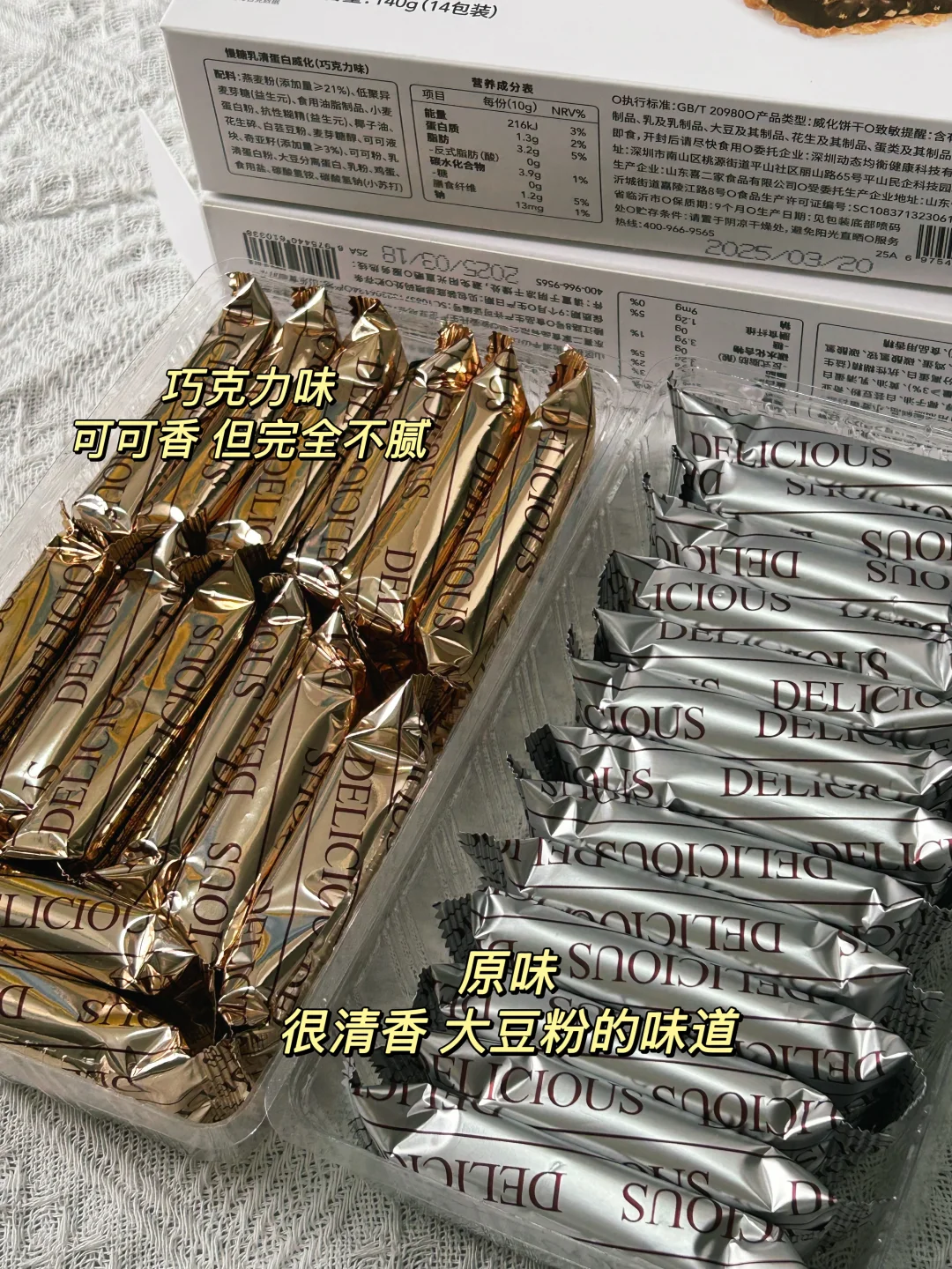 🥰有原味和巧克力味多样选择,吃起来口感酥脆,夹心清甜不腻,甜度刚刚好~每块仅52kcal!