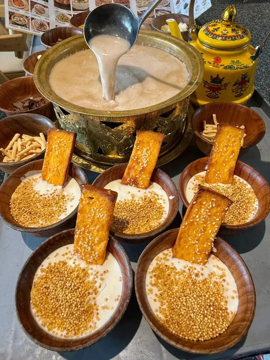 必体验:锅茶!这是蒙餐的灵魂。现场炒制小米、牛肉干、奶皮子,然后倒入浓香的奶茶煮沸,咸香醇厚,一锅够4-5人喝。