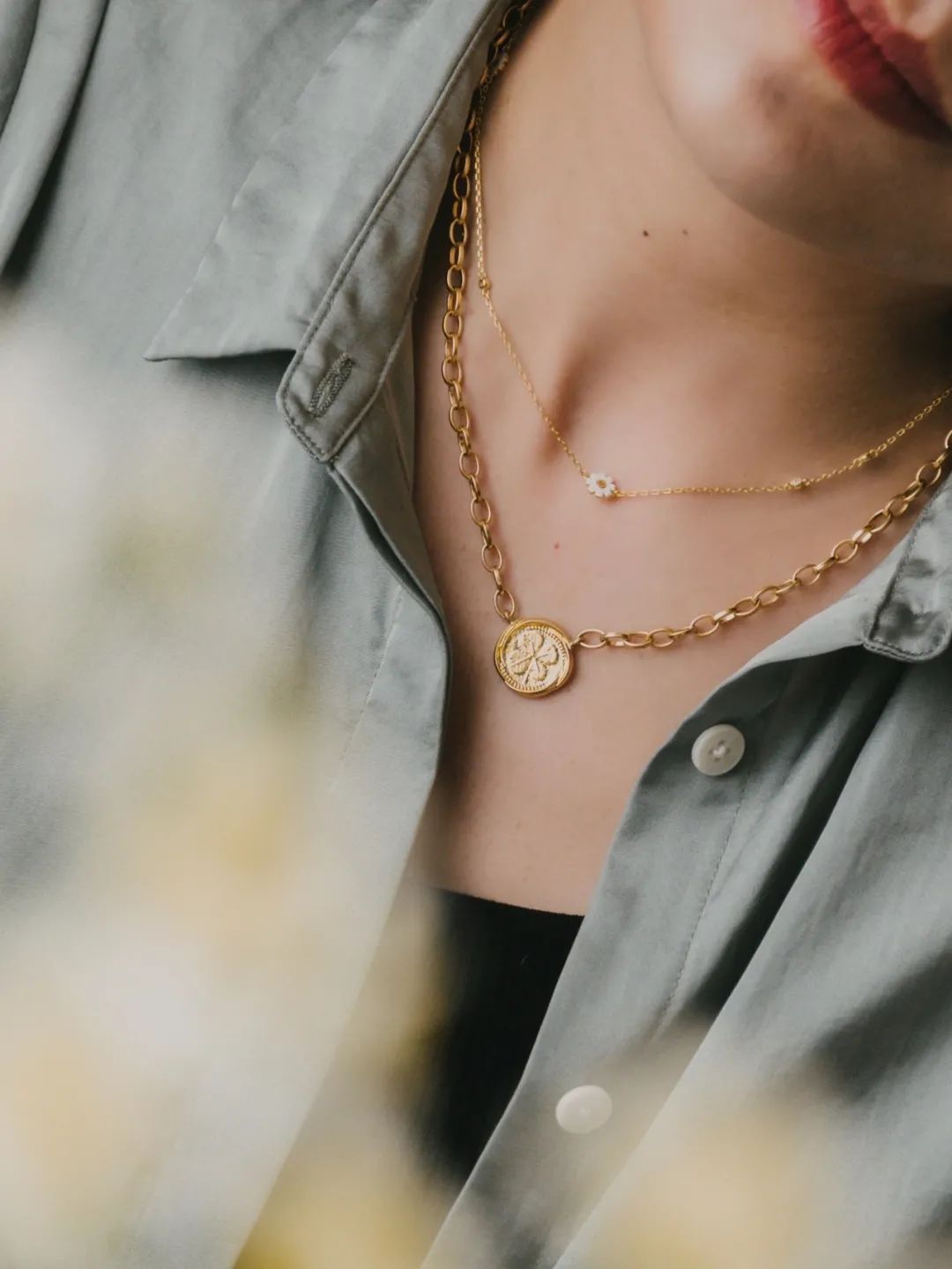 小雏菊是锁骨链的长度,因为坠子够袖珍,能和大部分项链叠戴。之前我就把它和四叶草硬币项链叠过👇等于多了条新的!(之前就买了它,就赶紧翻翻抽屉,试试把戴腻的项链起死回生。)