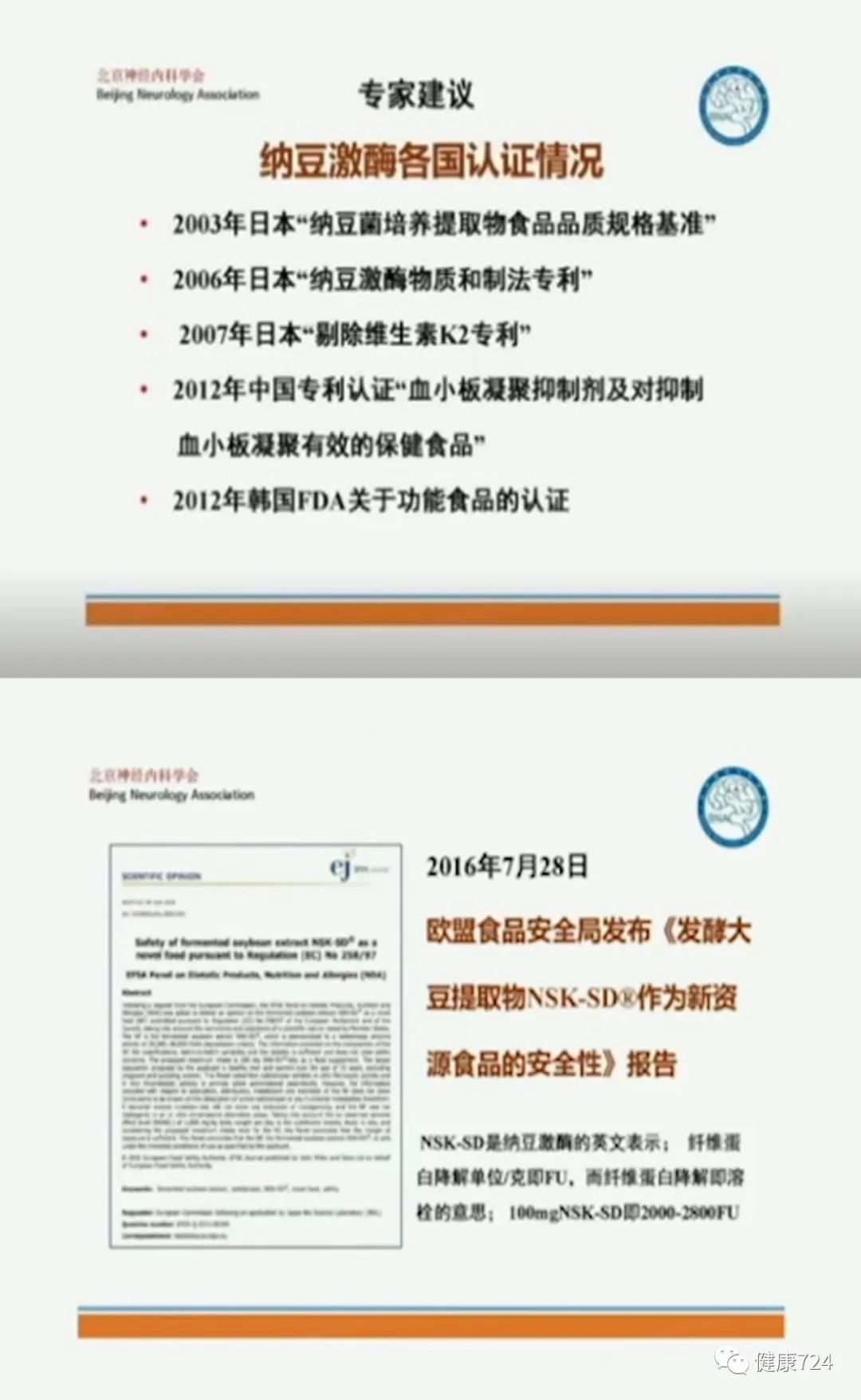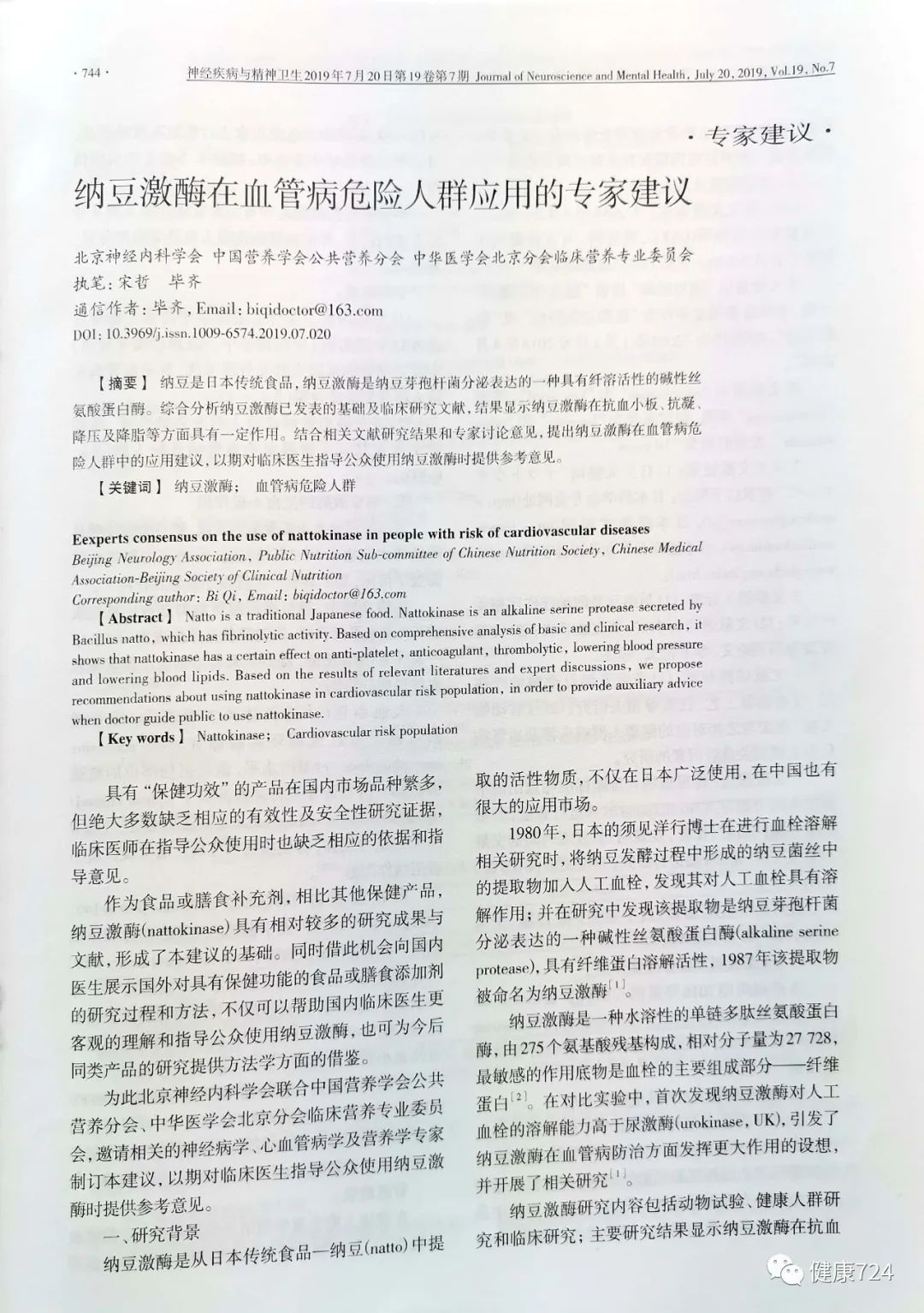 2019年11月20日由3家学术机构、20家国内知名医疗机构、33位临床神经内科专家、心血管内科专家、营养专家和其它专家、历时2年多的研究、论证、审核通过,中国科技核心期刊、中国医师协会临床学术期刊《神经疾病和精神卫生》公开出版《纳豆激酶在血管病危险人群应用的专家建议》。