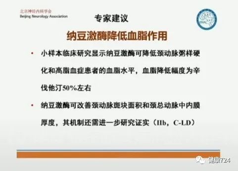 纳豆激酶可降低颈动脉粥样硬化和高脂血症患者的血脂水平,血脂降低幅度是辛伐他汀的50%左右, 还可改善颈动脉斑块面积和颈总动脉中内膜厚度。