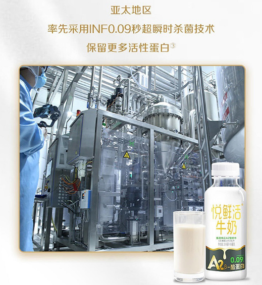 悦鲜活牛奶就不一样了哦,采用0.09秒超瞬时杀菌技术,用蒸汽直接对牛奶加热,较大限度的保留牛奶活性物质的同时,更加彻底的杀灭有害菌,可以称为新一代鲜牛奶!