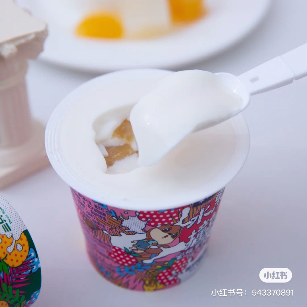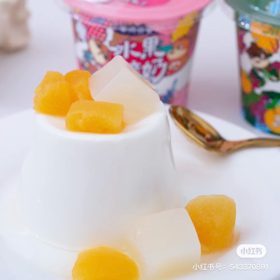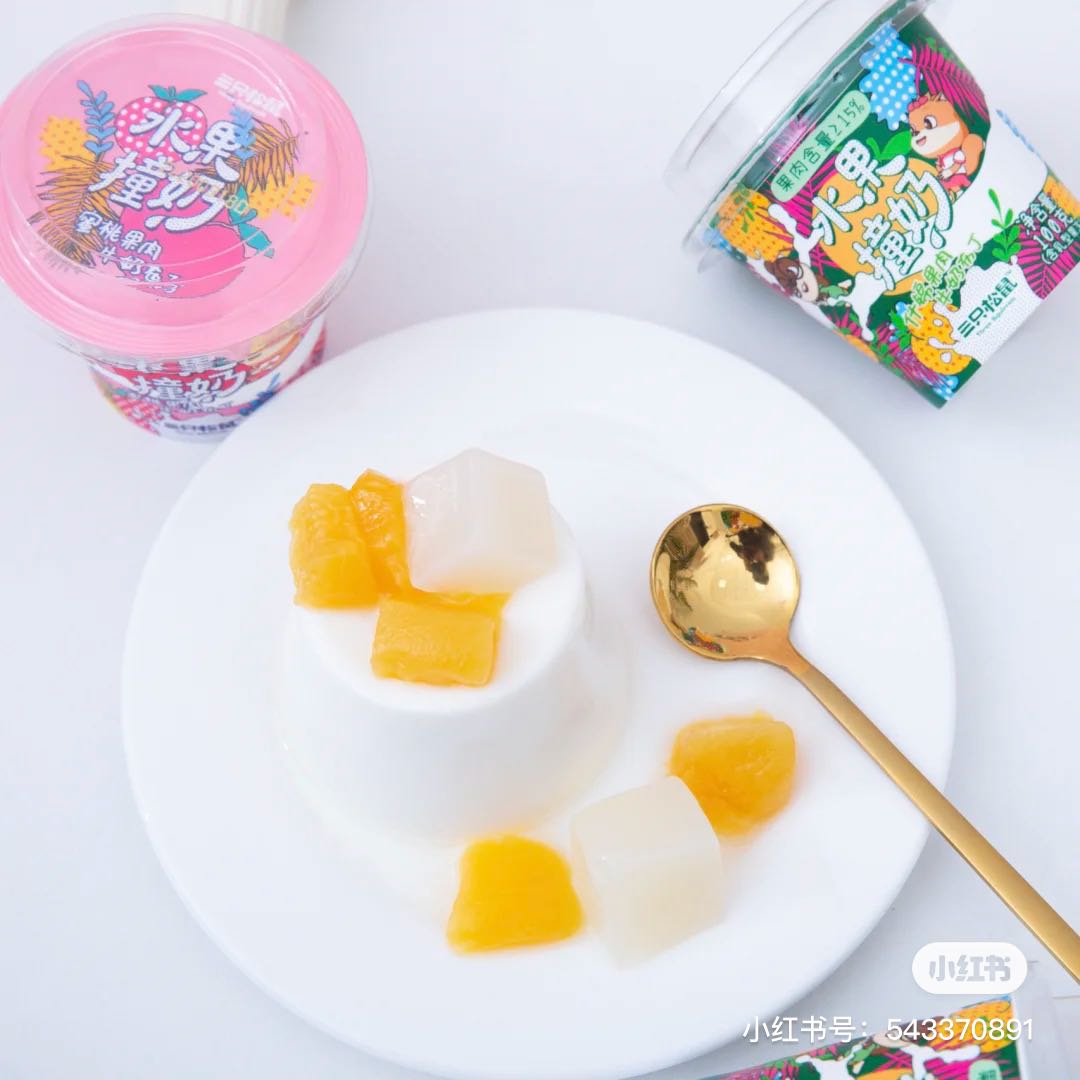 🌟什锦果肉里面有黄桃和蜜桔果肉,大颗粒的果肉搭配进口奶粉,口感细腻嫩滑~