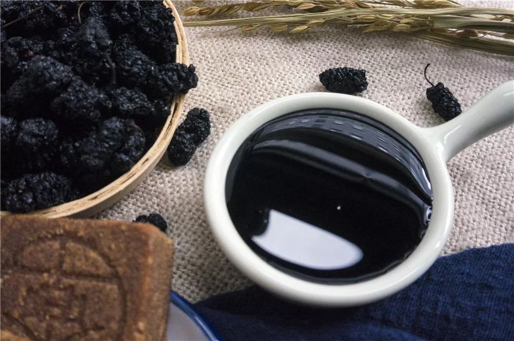 桑椹配酒是一对互补的组合,而桑椹醋则是要加强酸敛补肺的作用,着重于补益肺肾精气,乌须黑发,安神定志。