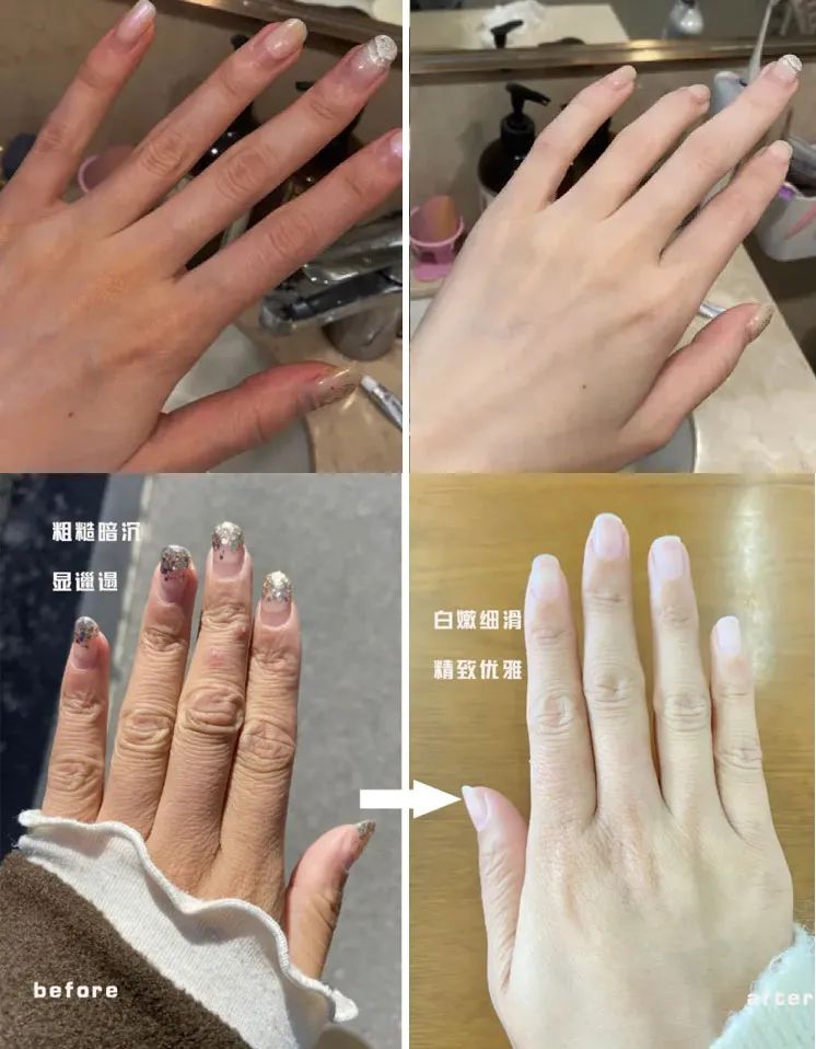 双手明显比之前更提亮了,即使和脸对比起来也不会有什么色差,简单说就是让你的手变软!变嫩!变bai!