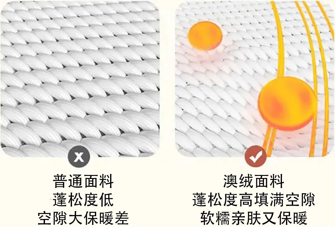 精髓就在于面料的两面都进行了微起绒磨毛处理,蓬松度几乎是一般织物的2倍,已经被业内人士称为“小羊绒”!