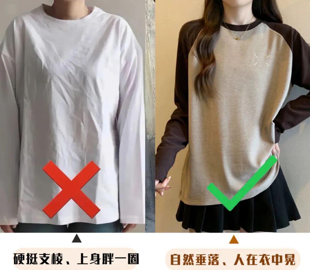 同样是宽松式的打底,像左边这种纯棉没垂感的款就只能直愣愣的套在身上,是不是更显得肩厚腰粗?