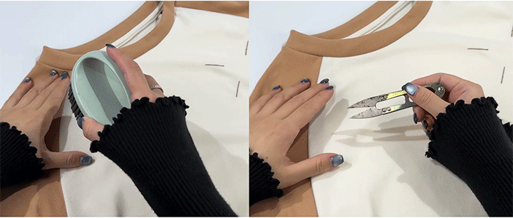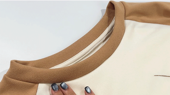连领口的走线细节都给你安排得细致细致再细致,包边走线全部设计成隐形滚条走线,隐藏到衣服内层。