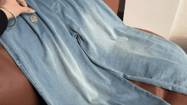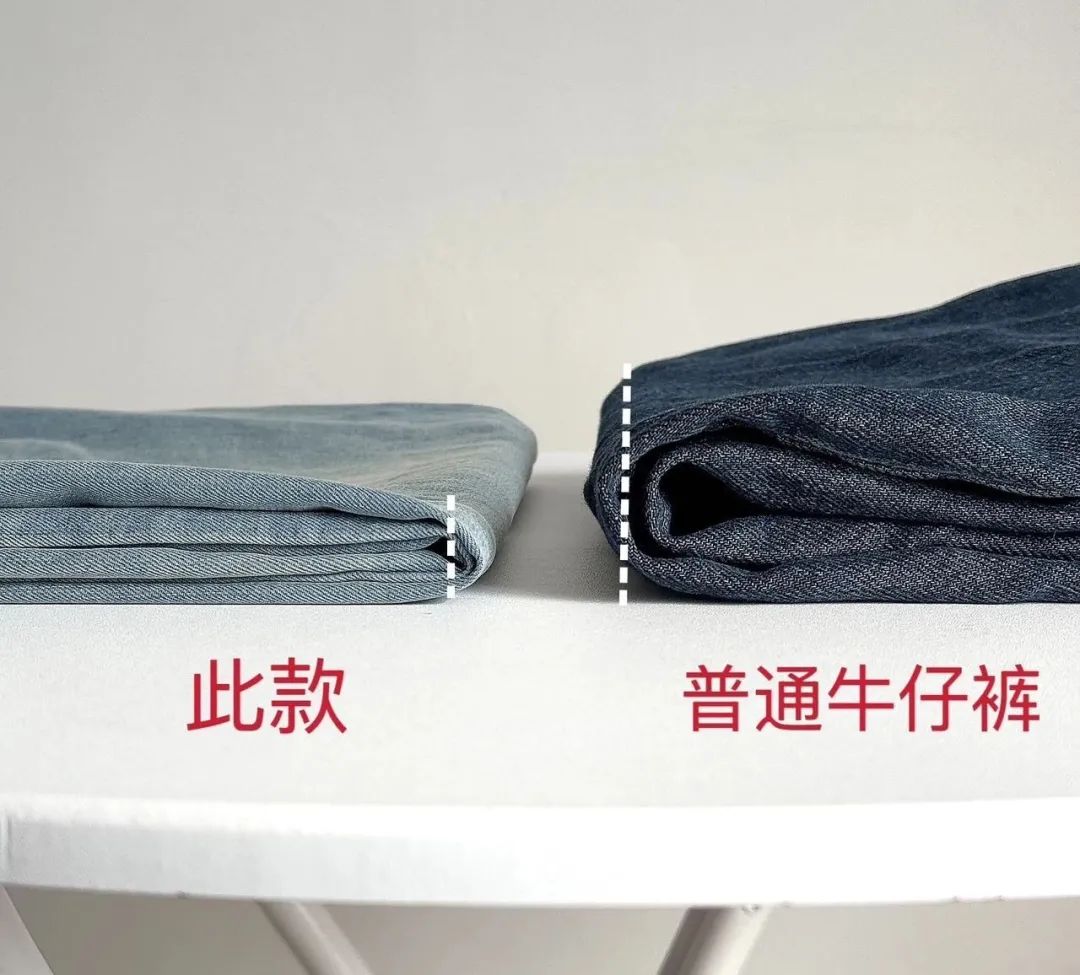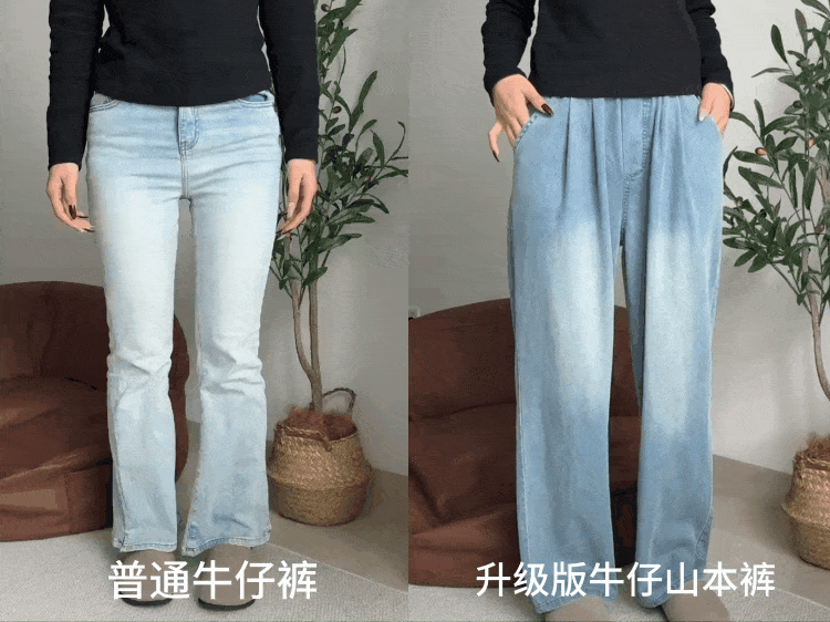 看看同时试穿对比,普通牛仔裤和天丝牛仔山本裤的差距立马就上来了!