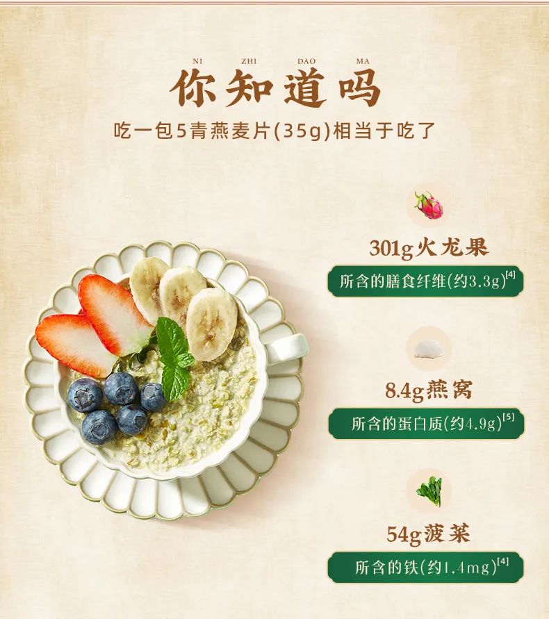 里面还含有多种矿物质,吃1包【5青燕麦片】相当于吃了301g火龙果+8.4g燕窝+54g菠菜!