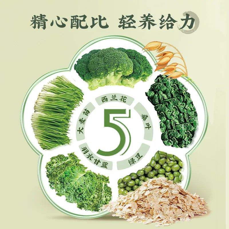 绿豆+桑叶+羽衣甘蓝+西蓝花+大麦苗,5种精選的绿色蔬食融合一起,每天1包就能补充5种能量。
