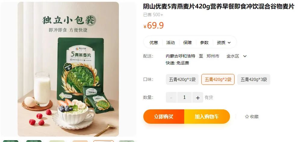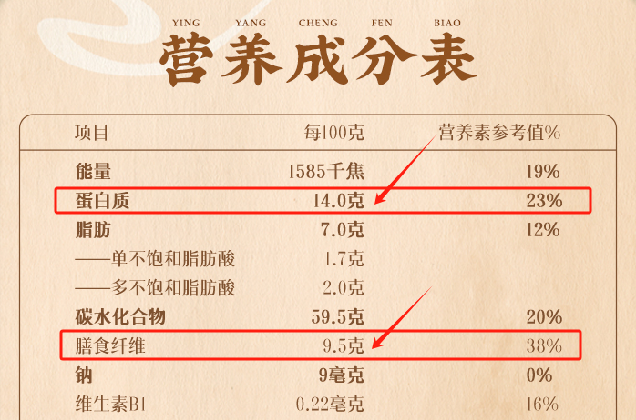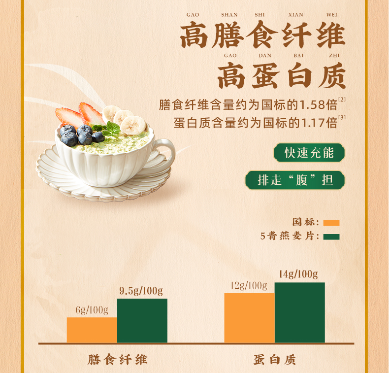 而这款【5青燕麦片】中每100g燕麦片中含有9.5g膳食纤维和14g蛋白质,比国标的要求高出1倍多呢。