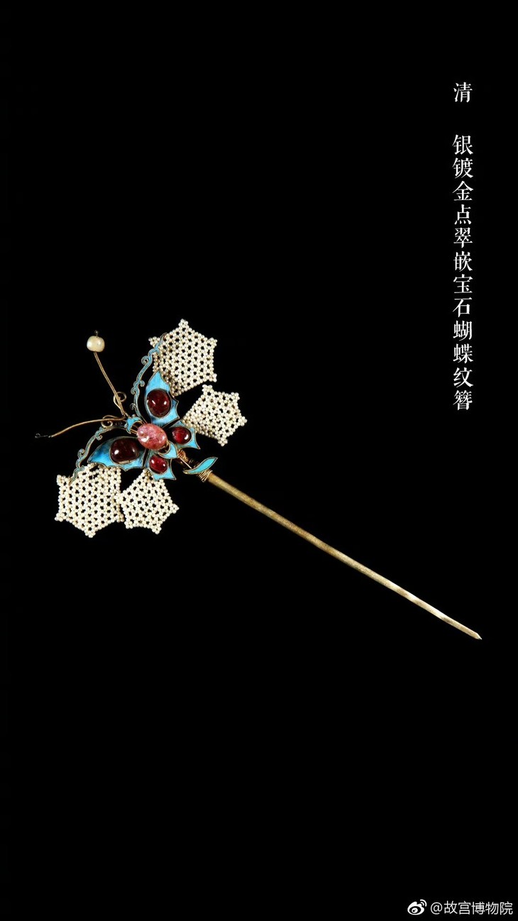蝴蝶因形美、色美,且 “蝶” 谐音 “耋”(寓意高寿 ),又因《梁祝》化蝶传说,成为忠贞爱情象征,是传统纹样里的 “宠儿”,在清代后妃首饰中,传递美好情感与期许。