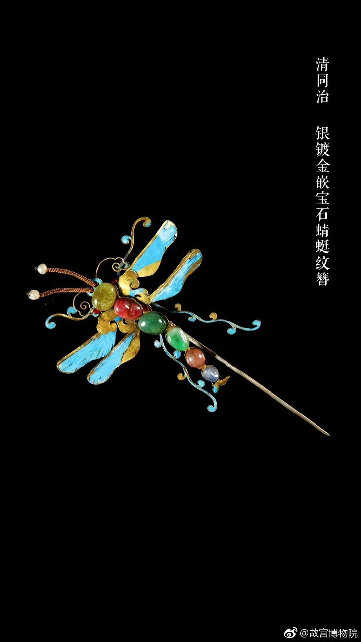 蜻蜓谐音 “清廷”,寓意 “清正廉洁”,也有 “亭亭玉立” 之美,受年轻女子喜爱。簪子上的蜻蜓,定格盘旋起舞瞬间,翅膀用点翠、宝石营造飘动感,灵动又具审美价值,把自然之美与文化寓意结合。