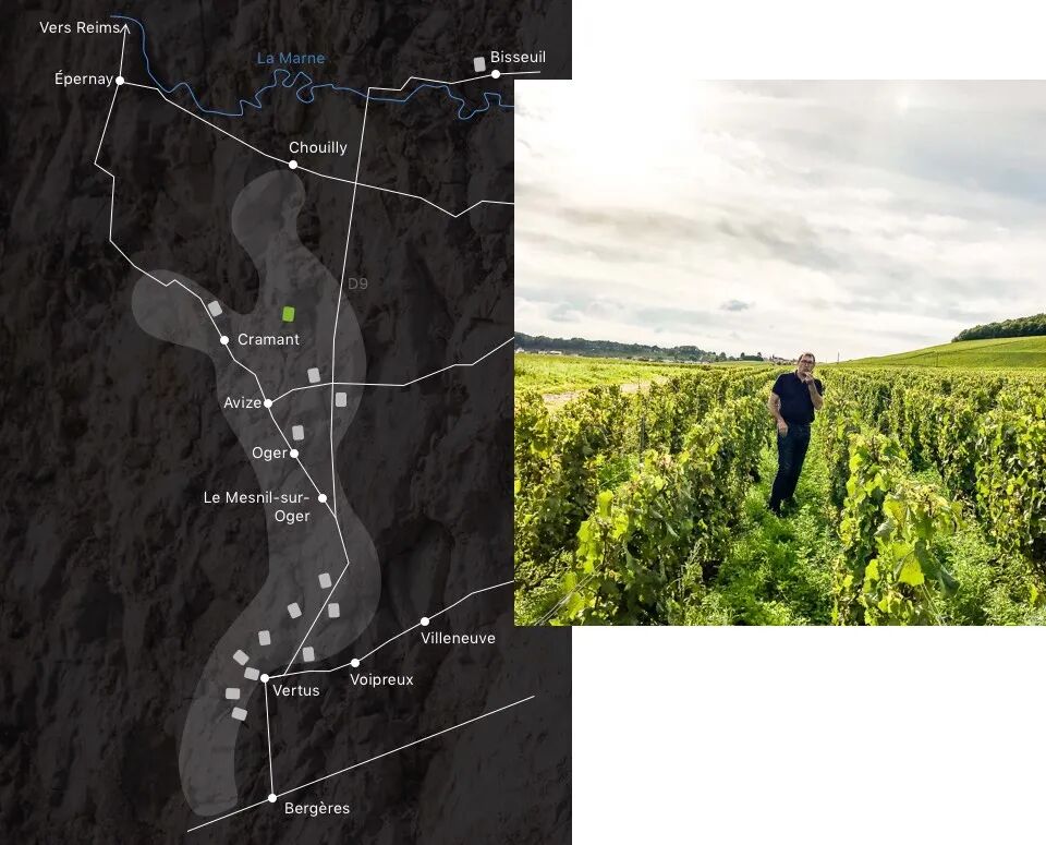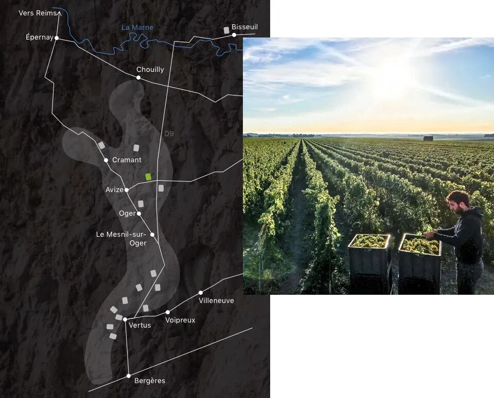 这片葡萄园位于 Cramant Grand Cru 的单一地块 Bourron du Levant。“Levant”在法语中意为东方,这里的葡萄园面向东南,每天清晨第一缕阳光最先照亮藤蔓。与山坡另一侧朝西的葡萄园相比,东向坡面赋予葡萄更充沛的能量与更明确的结构,葡萄藤树龄 60 至 85 年以上,最终汇聚为酒杯中更丰富、更立体的风味层次。