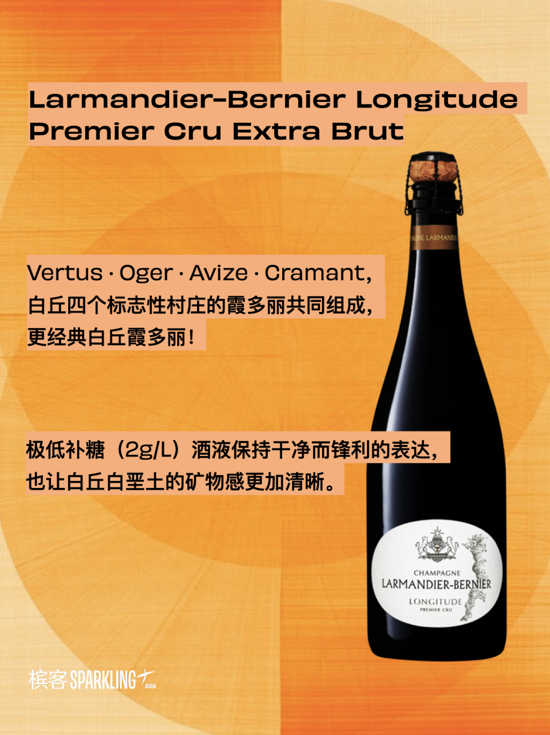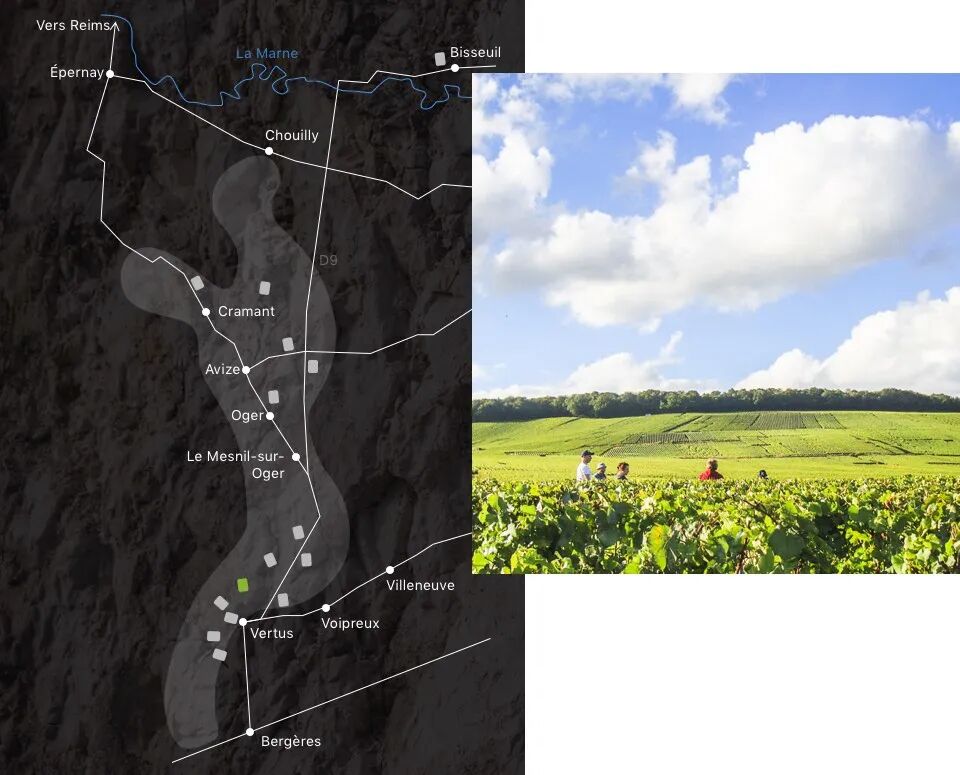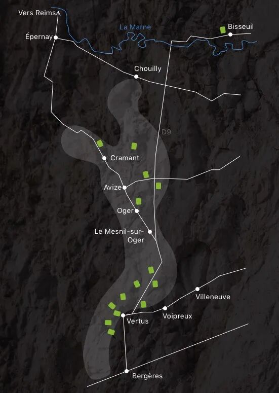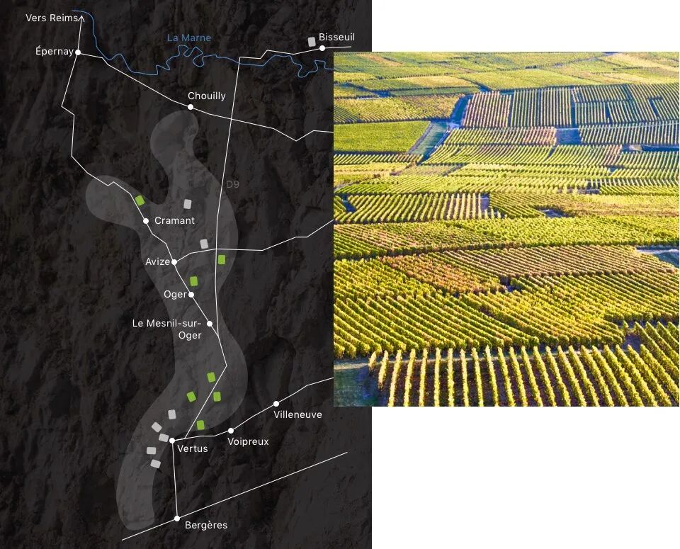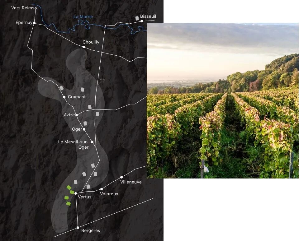 这款酒并不是来自单一村庄,而是由白丘四个标志性村庄的霞多丽共同组成:Oger、Avize、Cramant、Vertus。这些村庄几乎排列在接近第四子午线的一条纵线上,于是酒庄用“经度”来命名这款香槟,既指向地理,也暗示酒体修长而精准的结构线条。