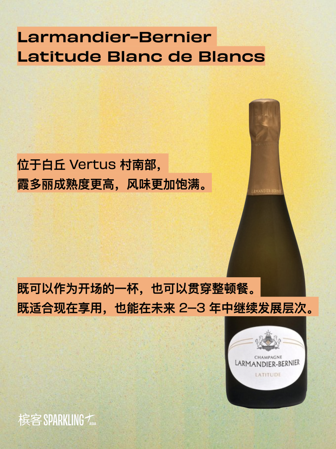 在 Larmandier-Bernier 的酒款中,Latitude 是最“亲和”的一款。酒名 Latitude(纬度)指向其产自白丘 Vertus 村南部的葡萄园——这里的霞多丽成熟度更高,风味饱满,带来柔和圆润,不失矿物张力的白丘风味结构,既有风土深度,也足够易饮。